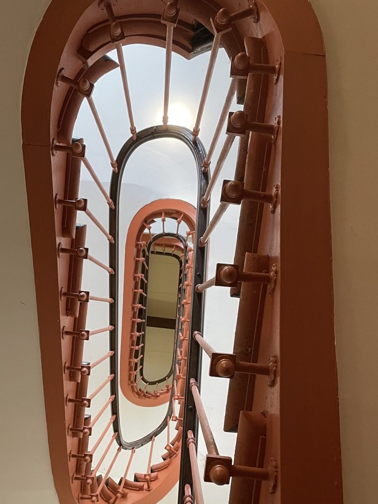Like the glass, the tiles in the hallway and the main staircase seem to me to be from the 19th century, but it’s hard to say whether that was when the building was erected. It was revamped into the present condominium enterprise 40 years ago, but probably had contained apartments long before that.
